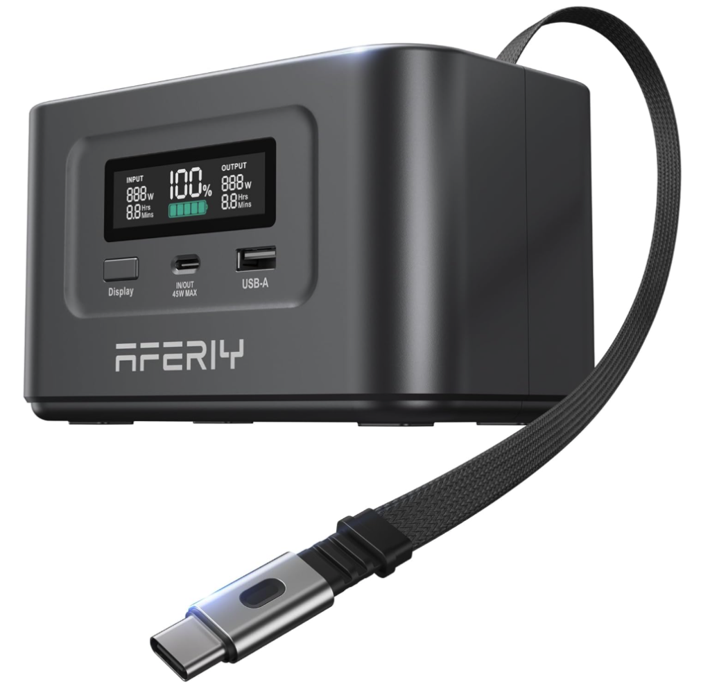 AFERIY 145W DC Portable Power Station w/ 100W PD Retractable USB-C Cable, 99.2Wh LiFePO4 Battery Dual Way 100W PD, Solar Generator. Promotional Code Save $20: AFERIY49